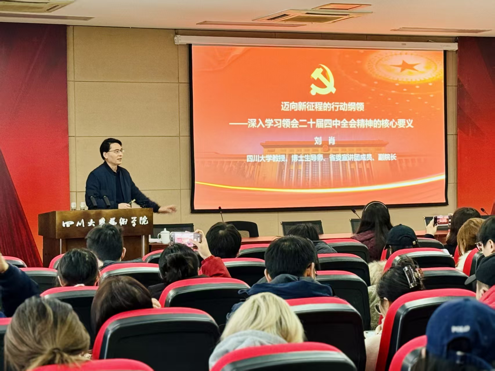 覃孟念书记在总结时指出,刘肖教授围绕深刻领会“十四五”时期我国经济社会发展的重大成就、“十五五”时期经济社会发展的目标要求和重大举措,结合学校工作实际,对党的二十届四中全会精神进行了全面系统的宣讲,为全院师生党员深刻理解全会精神提供了扎实的理论支撑。希望学院各支部和全体党员要切实把思想和行动统一到全会精神上来,持续在学深悟透上下功夫,紧密结合学科特色和国家需求,把学习成果转化为推动谋划推动学院“十五五”发展的强大动力,为实现中国式现代化谱写川大艺术新篇章。